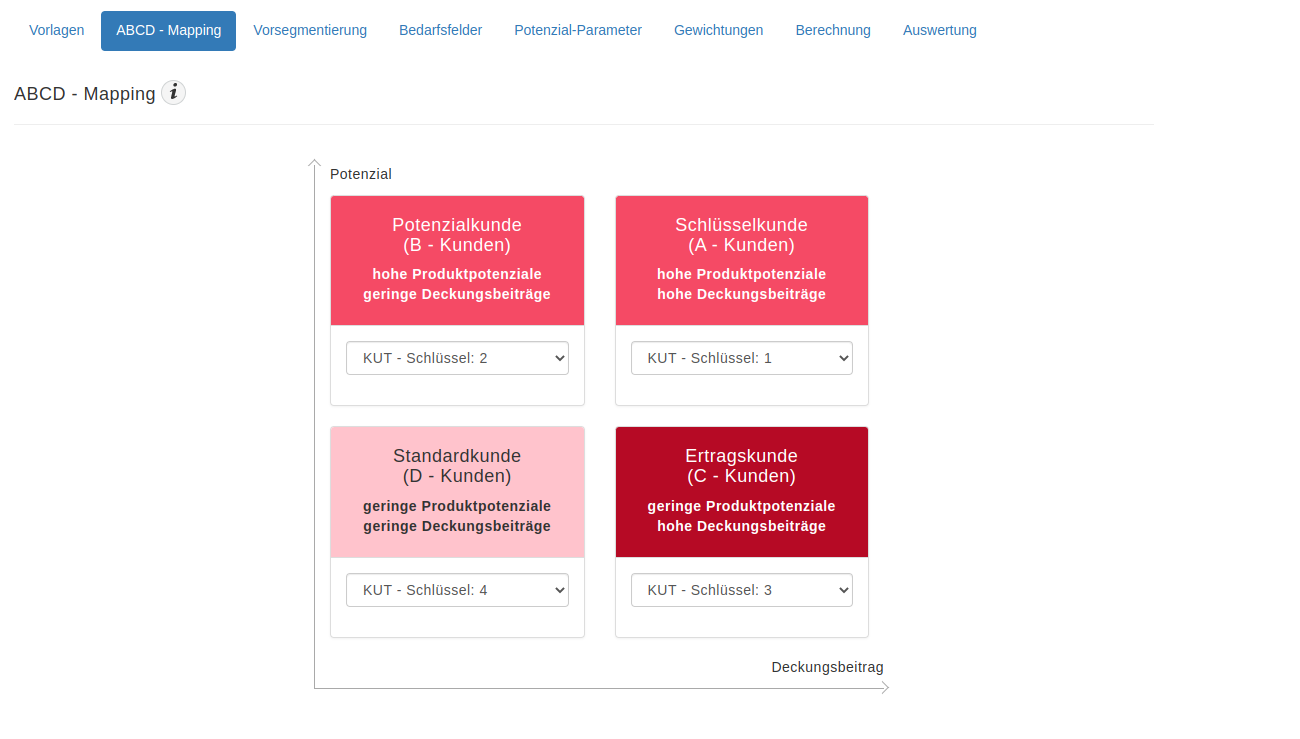 Potenzialmatrix Die Potenzial-Segmentierung ist eine tiefergehende Betrachtung einzelner Potenziale je Kundenverbund. Es basiert auf der Grobsegmentierung und ist ohne eine vorhergehende Berechnung der Grobsegmentierung nicht nutzbar. Die Ergebnisse ...