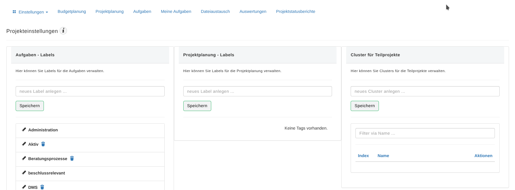 Im letzten Schritt können Kategorien (Labels) für Aufgaben und Projektplanungen sowie Cluster für die Gruppierung von Teilprojekten angelegt werden.